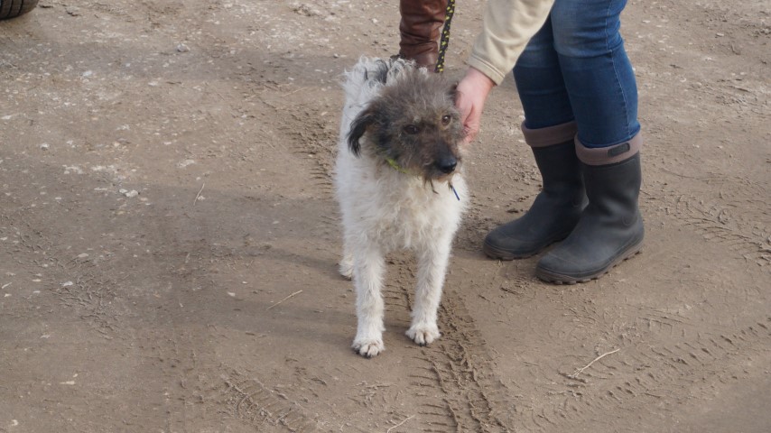 Olgi közepes testű , fehér barna félhosszú szőrű foxterrier jellegű szuka.