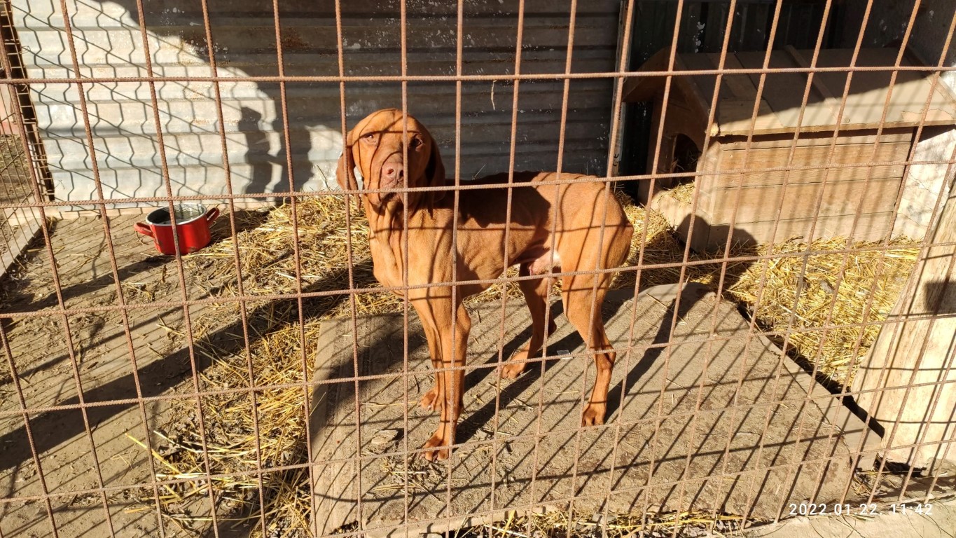 A hátsó udvaron van egy vizsla ami az utcáról nem látható írta a bejelentő, nagyon sovány nincs rendes háza. Megnéztük, valóban egy háznak nem nevezhető valaminél volt kikötve.